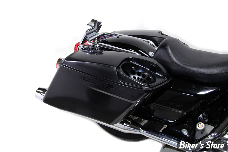 Le couvercle du sac de selle côté droit avec découpe de haut-parleur présente une finition noire.