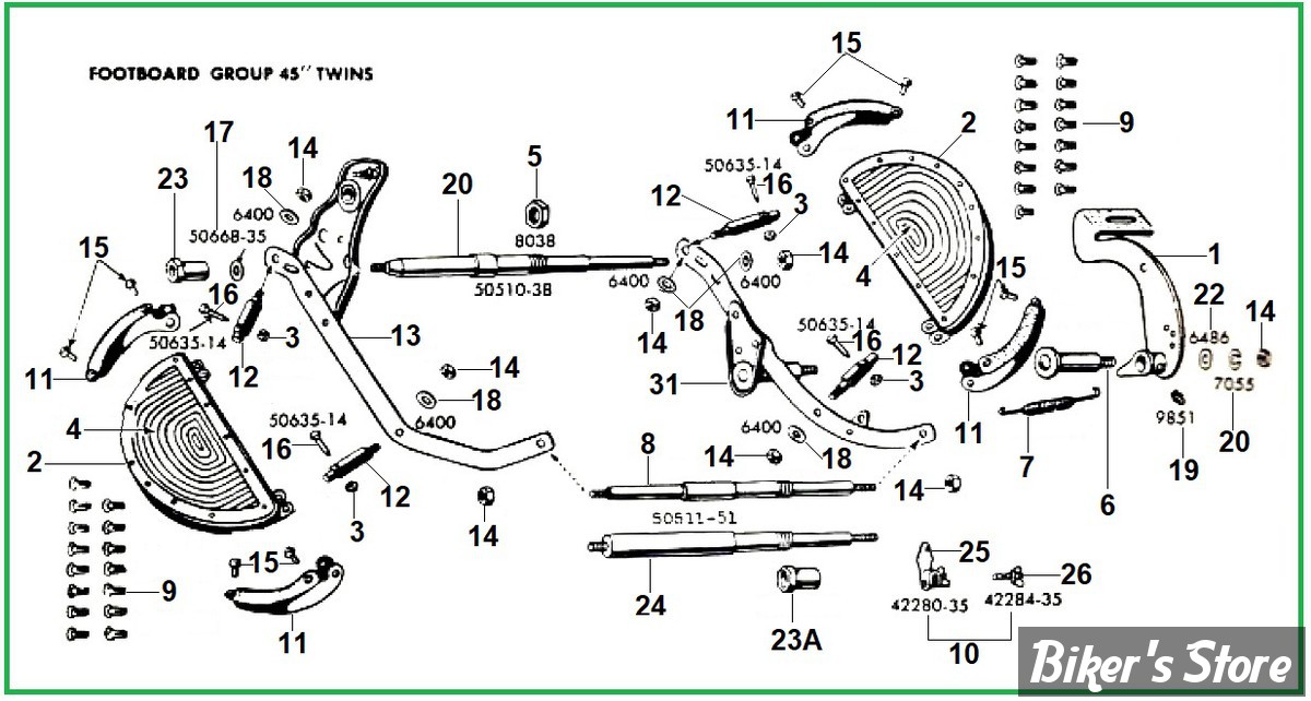 Eclaté des pièces de fixation de plateformes AVANT des 750cc / 45ci de 1929 à 1973