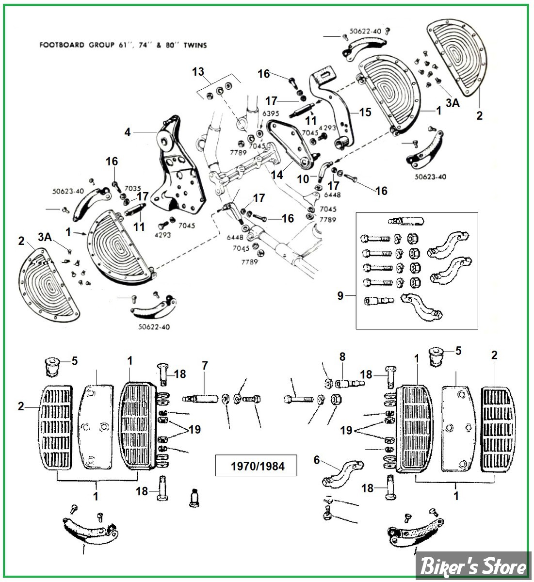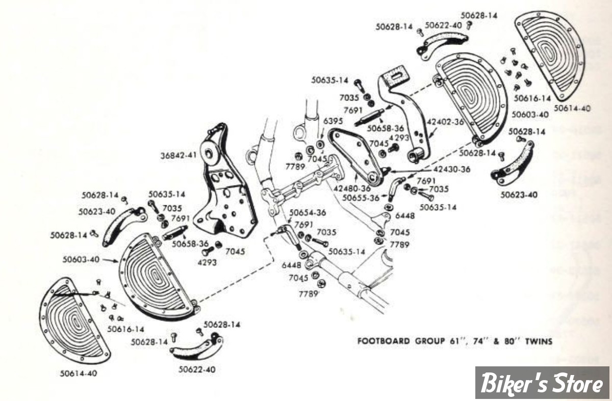 Eclaté des pièces de fixation de plateformes AVANT des BigTwin de 1940 à 1984 (sauf Softail).