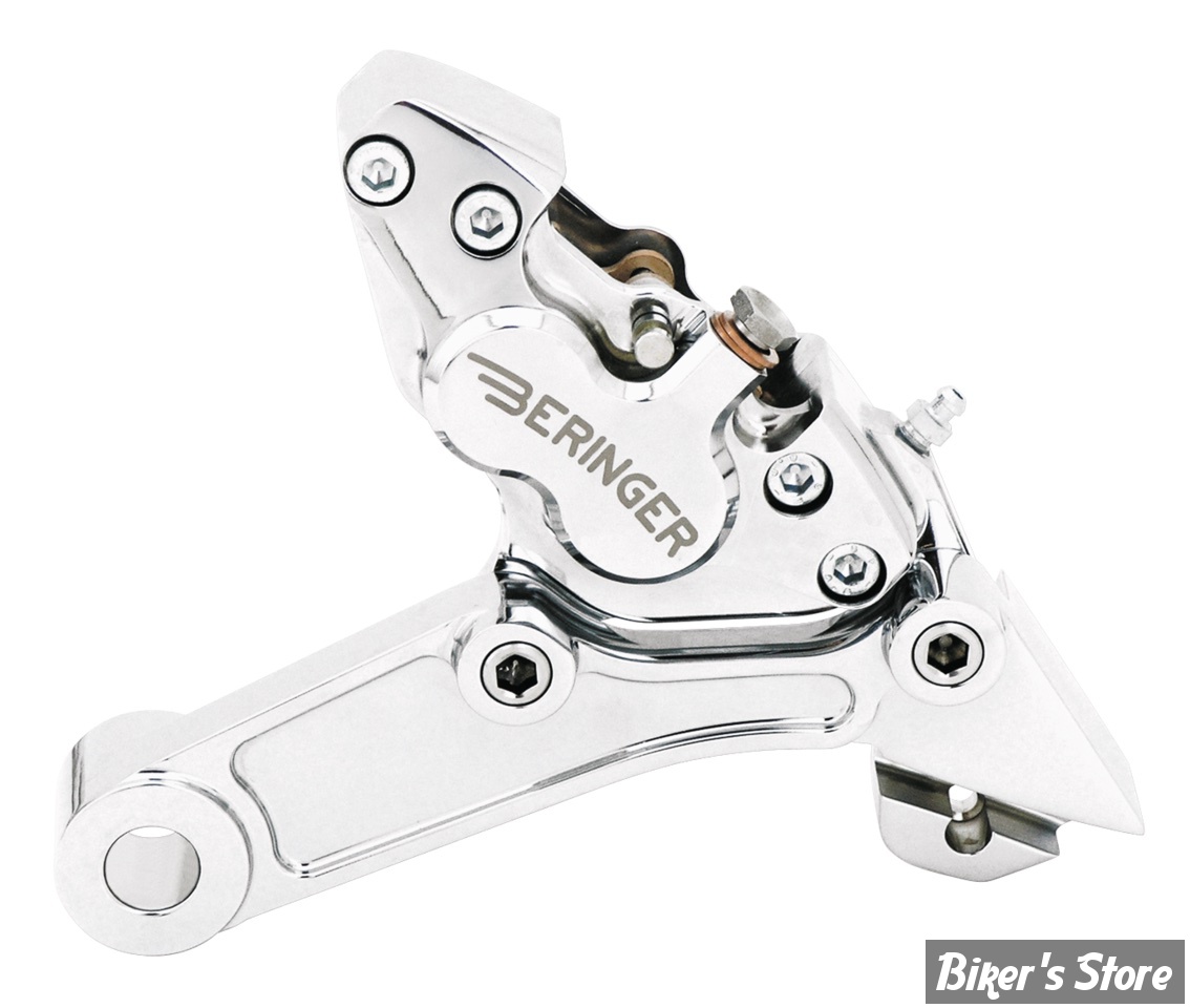 Beringer fabrique des freins depuis plus de 15 années et est apprécié par beaucoup d'usines et de teams de course pour leur exceptionnelle fiabilité. Cette compagnie a achevé un avantage technologique décisif avec leurs innovations brevetées. Beringer est également le fabricant pour n'importe quelles autres motos. Les freinages Beringer sont fabriqués selon les normes ISO 9001 et sont homologuées. Ces étriers sont usinés en aluminium de qualité aviation, le même qui est utilisé dans dans les avions supersoniques. Cet aluminium combine la réduction de poids, résistance à la déformation, même à haute température. Les pistons sont alliage d'inox. L'inox ne conduit qu'un treizième de la châleur conduite par l'aluminium ce qui isole parfaitement l'étrier de la châleur générée par les plaquettes. De plus les pistons en inox éliminent la possibilité de corrosion. Tous les étriers sont usinés CNC pour répondre aux plus hauts standards et pour garantir une épaisseur optimale des matériaux. Les étriers Beringer se distinguent par un freinage incisif avec un temps de réponse très court. Un freinage plus fort et plus aggressif est obtenu avec un effort au levier constant. Avec ces étriers il faut seulement 16.5 bars de pression pour avoir le même résultat que d'autres étrier avec 20 bars. Ces étriers sont disponibles pour l'avant ou pour l'arrière en versions 4-pistons ou 6-pistons et finitions polie, noire anodisée ou chromée.