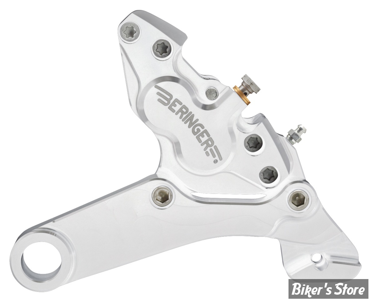 Beringer fabrique des freins depuis plus de 15 années et est apprécié par beaucoup d'usines et de teams de course pour leur exceptionnelle fiabilité. Cette compagnie a achevé un avantage technologique décisif avec leurs innovations brevetées. Beringer est également le fabricant pour n'importe quelles autres motos. Les freinages Beringer sont fabriqués selon les normes ISO 9001 et sont homologuées. Ces étriers sont usinés en aluminium de qualité aviation, le même qui est utilisé dans dans les avions supersoniques. Cet aluminium combine la réduction de poids, résistance à la déformation, même à haute température. Les pistons sont alliage d'inox. L'inox ne conduit qu'un treizième de la châleur conduite par l'aluminium ce qui isole parfaitement l'étrier de la châleur générée par les plaquettes. De plus les pistons en inox éliminent la possibilité de corrosion. Tous les étriers sont usinés CNC pour répondre aux plus hauts standards et pour garantir une épaisseur optimale des matériaux. Les étriers Beringer se distinguent par un freinage incisif avec un temps de réponse très court. Un freinage plus fort et plus aggressif est obtenu avec un effort au levier constant. Avec ces étriers il faut seulement 16.5 bars de pression pour avoir le même résultat que d'autres étrier avec 20 bars. Ces étriers sont disponibles pour l'avant ou pour l'arrière en versions 4-pistons ou 6-pistons et finitions polie, noire anodisée ou chromée.