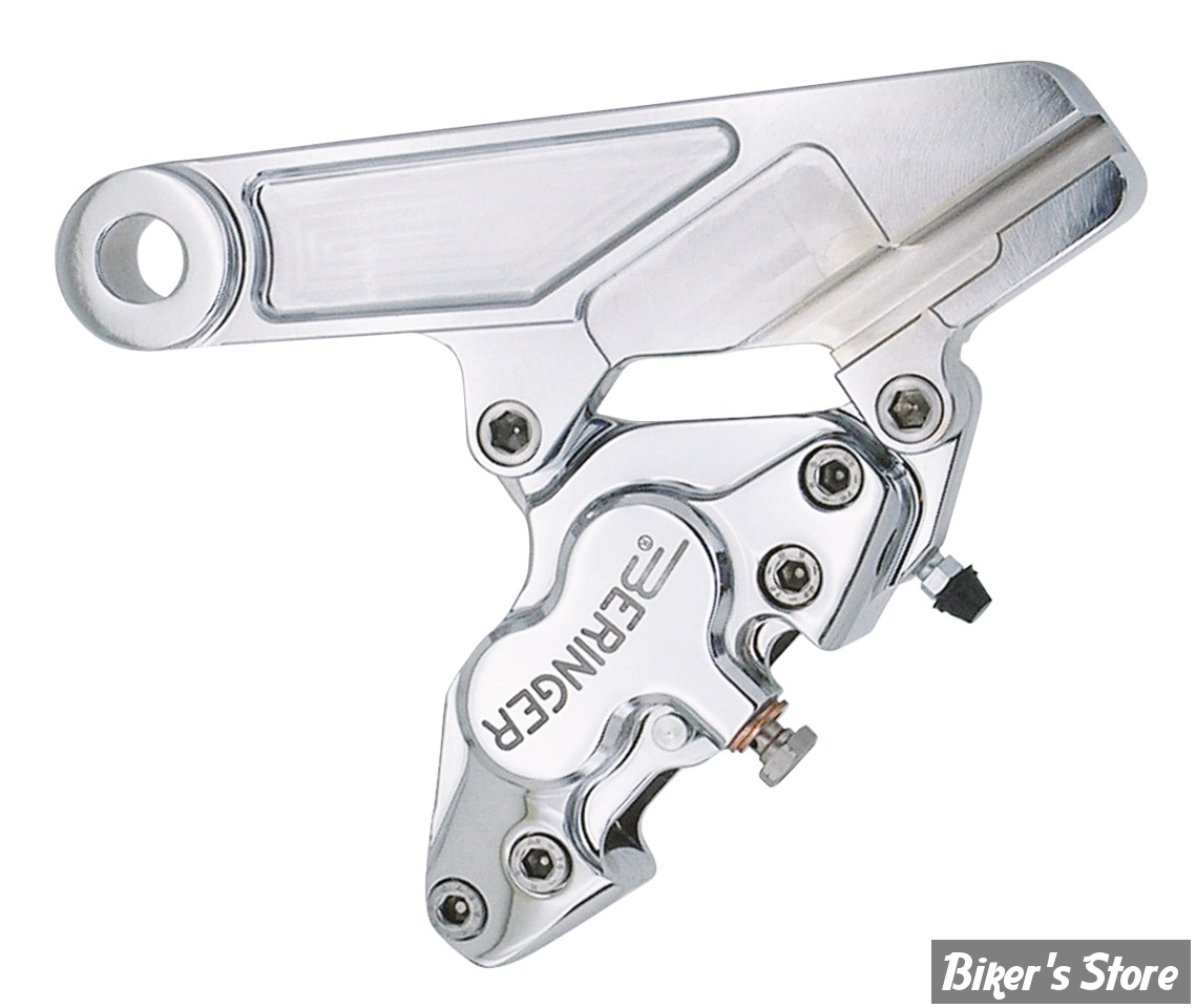 Beringer fabrique des freins depuis plus de 15 années et est apprécié par beaucoup d'usines et de teams de course pour leur exceptionnelle fiabilité. Cette compagnie a achevé un avantage technologique décisif avec leurs innovations brevetées. Beringer est également le fabricant pour n'importe quelles autres motos. Les freinages Beringer sont fabriqués selon les normes ISO 9001 et sont homologuées. Ces étriers sont usinés en aluminium de qualité aviation, le même qui est utilisé dans dans les avions supersoniques. Cet aluminium combine la réduction de poids, résistance à la déformation, même à haute température. Les pistons sont alliage d'inox. L'inox ne conduit qu'un treizième de la châleur conduite par l'aluminium ce qui isole parfaitement l'étrier de la châleur générée par les plaquettes. De plus les pistons en inox éliminent la possibilité de corrosion. Tous les étriers sont usinés CNC pour répondre aux plus hauts standards et pour garantir une épaisseur optimale des matériaux. Les étriers Beringer se distinguent par un freinage incisif avec un temps de réponse très court. Un freinage plus fort et plus aggressif est obtenu avec un effort au levier constant. Avec ces étriers il faut seulement 16.5 bars de pression pour avoir le même résultat que d'autres étrier avec 20 bars. Ces étriers sont disponibles pour l'avant ou pour l'arrière en versions 4-pistons ou 6-pistons et finitions polie, noire anodisée ou chromée.