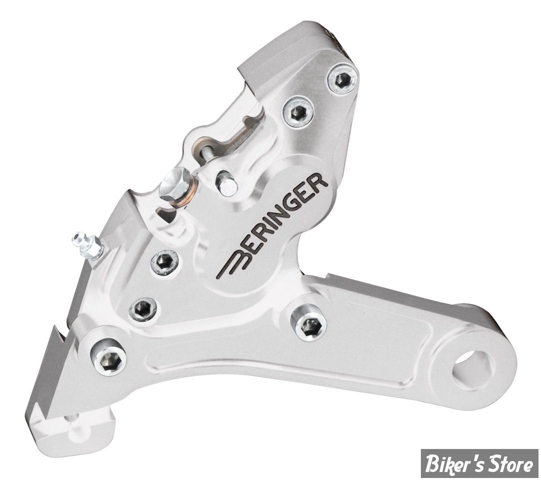 Beringer fabrique des freins depuis plus de 15 années et est apprécié par beaucoup d'usines et de teams de course pour leur exceptionnelle fiabilité. Cette compagnie a achevé un avantage technologique décisif avec leurs innovations brevetées. Beringer est également le fabricant pour n'importe quelles autres motos. Les freinages Beringer sont fabriqués selon les normes ISO 9001 et sont homologuées. Ces étriers sont usinés en aluminium de qualité aviation, le même qui est utilisé dans dans les avions supersoniques. Cet aluminium combine la réduction de poids, résistance à la déformation, même à haute température. Les pistons sont alliage d'inox. L'inox ne conduit qu'un treizième de la châleur conduite par l'aluminium ce qui isole parfaitement l'étrier de la châleur générée par les plaquettes. De plus les pistons en inox éliminent la possibilité de corrosion. Tous les étriers sont usinés CNC pour répondre aux plus hauts standards et pour garantir une épaisseur optimale des matériaux. Les étriers Beringer se distinguent par un freinage incisif avec un temps de réponse très court. Un freinage plus fort et plus aggressif est obtenu avec un effort au levier constant. Avec ces étriers il faut seulement 16.5 bars de pression pour avoir le même résultat que d'autres étrier avec 20 bars. Ces étriers sont disponibles pour l'avant ou pour l'arrière en versions 4-pistons ou 6-pistons et finitions polie, noire anodisée ou chromée.