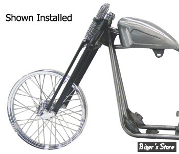 Ces fourches sont sans déport et ne sont pas de simples copies de la fourche Springer stock mais elles ont entièrement reconçues et repensées, elles ont deux contre ressorts internes pour le confort. Ces fourches sont livrées complètes avec leur axe de roue et écrou, balanciers, platine supérieure... L'axe de roue est prévu pour roulement de roue de 3/4" (19mm), l'axe de colonne à un diamètre de 1", acceptant des roulements de type Timken. La longueur d'origine est de 24" mesurée du Té inférieur au millieu de l'axe de roue avant. Les pattes de garde-boue, freinage, risers, roulements et accessoires doivent être commandés séparément. Entre axes des risers : 4 3/4", filetés en 1/2"-20. Freinage : Possibilité de pose à droite ou à gauche.