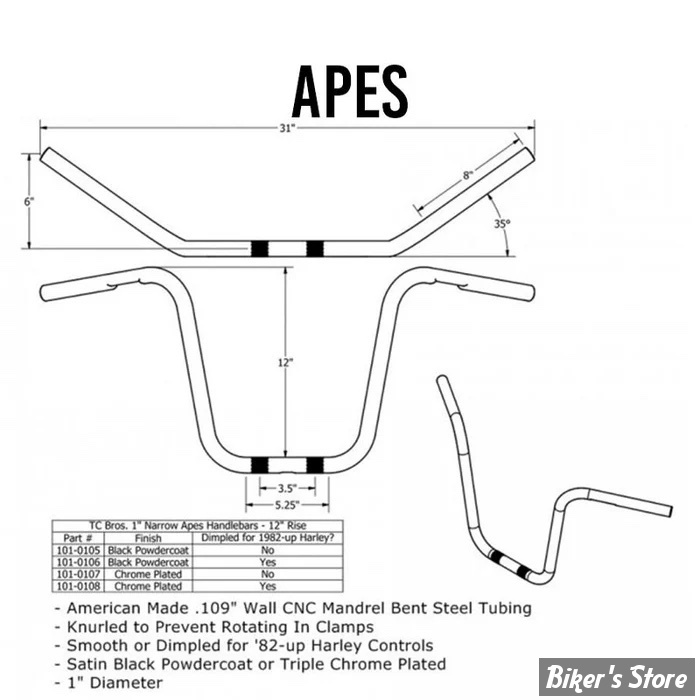 Guidon TC. BROS - TC BROS. 1" NARROW APES HANDLEBAR - APES 12" - SANS EMPREINTES - CHROME - 101-0107
