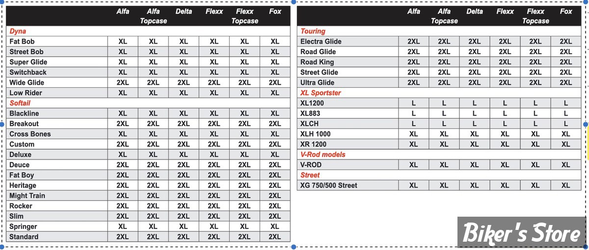 Pour connaître la taille de housse appropriée à votre moto (Harley), veuillez consulter le tableau des tailles (Voir Photo)