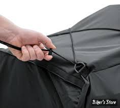 La base de la housse intègre des cordons réglables avant et arrière pour la fixer autour de la moto ainsi qu’une sangle horizontale permettant de réduire le gonflement sous l’effet du vent