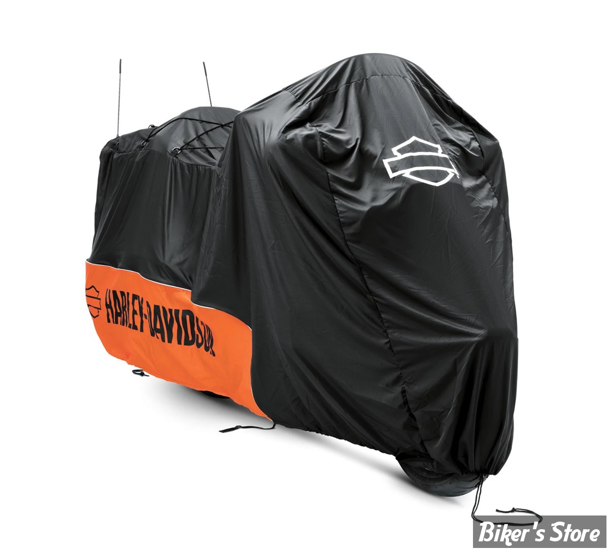 La housse intègre des cordons réglables avant et arrière pour la fixer autour de la moto ainsi qu’une sangle horizontale permettant de réduire le gonflement sous l’effet du vent