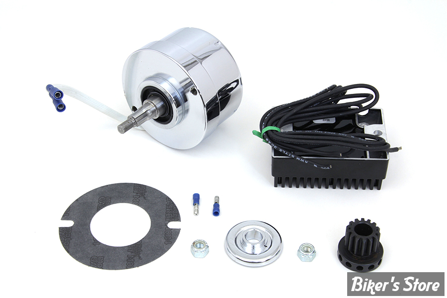 Maintenant, vous pouvez convertir votre anciennes génératrice Harley en un système d'alternateur 12V fiable qui donne 17 amp. L'alternateur va en place du générateur d'origine. Le kit comprend un alternateur, un régulateur/redresseur, un engrenage, un déflecteur d'huile et des vis de montage. Sur 1941-1957 Big Twin, les trous des vis de la génératrice doivent être agrandis à 5/16" pour s'adapter aux vis fournies.