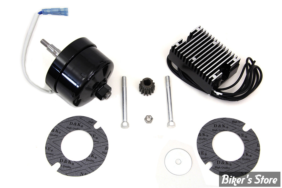 Black alternator bolts on in place of original 12 volt generator. Black solid state regulator, gear, gasket and mount screw set are included.