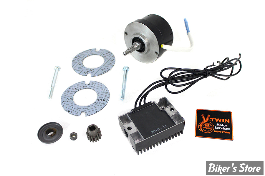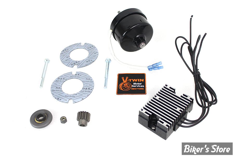 Black alternator bolts on in place of an original 12 volt generator. Black solid state regulator, gear, gasket and mount screw set are included.