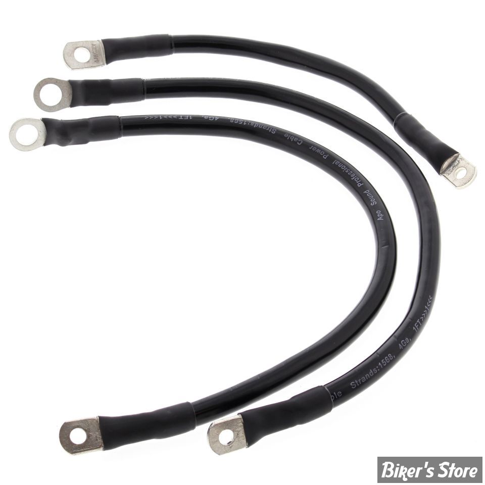 Contains 3 battery cables: 1x 9" long & 2x 16" long. Model specific 4 gauge (5.19mm diameter / 19mm²) battery cables equipped with 1/4" and 5/16" terminals. Manufactured with 36 gauge (0.005"/ 0.13mm diameter) copper wire strands. The 7 over 7 bundling of these copper strands guarantee both excellent current flow and flexibility of the cable. The outer jacket is rated up to 125°C and oil & gas resistant.