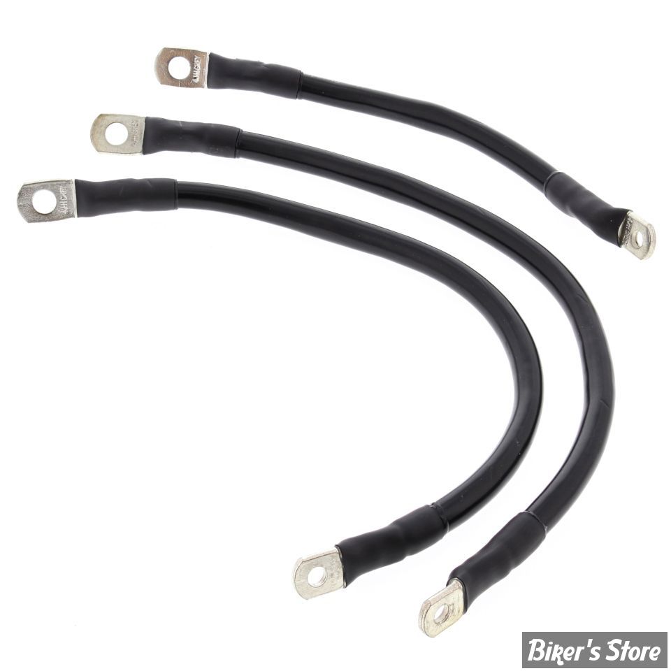 Contains 3 battery cables: 2x 13" long & 1x 8" long. Model specific 4 gauge (5.19mm diameter / 19mm²) battery cables equipped with 1/4" and 5/16" terminals. Manufactured with 36 gauge (0.005"/ 0.13mm diameter) copper wire strands. The 7 over 7 bundling of these copper strands guarantee both excellent current flow and flexibility of the cable. The outer jacket is rated up to 125°C and oil & gas resistant.