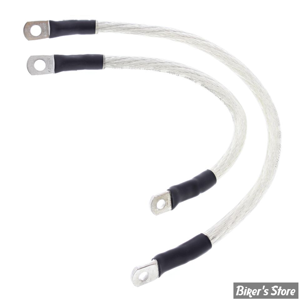 Kit de cables prévus pour un remplacement d'origine (batterie en lieu et place, sens de polarité d'origine). Equipés aux extrémités d'une cosse sertie de 1/4" et une autre de 5/16". Les meilleurs câbles du marché, prévus spécialement à cet effet. Issus de la technologie informatique, ils offrent d'excellentes qualités conductrices avec un minimum de pertes de tension.