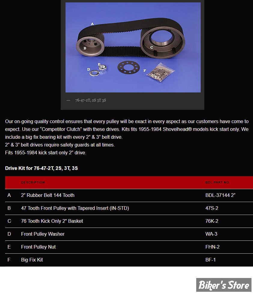 ur 2” & 3” drives are made from 356-T6 aluminum, cast in our own foundry and completely machined in house. Our on-going quality control ensures that every pulley will be exact in every aspect as our customers have come to expect. Use our “Competitor Clutch” with these drives. Kits fits 1955-1984 Shovelhead models kick start only. We include a big fix bearing kit with every 2” & 3” belt drive.