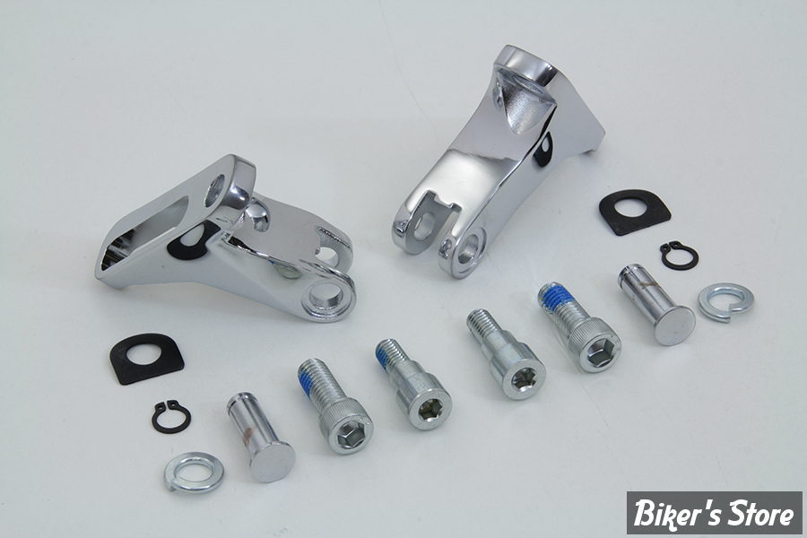 Chrome rear passenger mini footboard mount kit moves the passenger's foot inward and rearward to give the driver more space between the driver footboard and the passenger foot support.