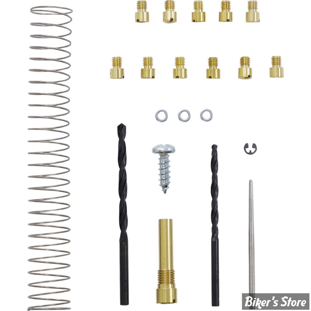 Ces nouveaux kits de réglage de carburateurs de Dyno-Jet constituent la meilleure solution pour l’élimination des trous à l’accélération des modèles Sportster et Big Twin de 1988 au présent équipés de carburateurs CV Keihin (origine). Les kits DynoJet permettent le réglage facile du carburateur sur les moteurs de série, sur les moteurs avec cames et échappements à haute performance et les motos equipées de filtre à ait aftermarket au débit d'air plus important. Chaque kit comprend un manuel de directions étape par étape. Il comprend aussi une gamme de gicleurs principaux, un diffuseur, une aiguille réglable avec intercalaires, un ressort et des forets.