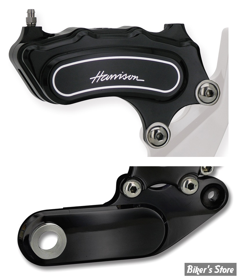 Ken Harrison de Harrison Engineering a été un des premiers dès 1986 à développer et dessiner des étriers de freins multi-pistons pour Harley-Davidson. Chaque étrier 4 ou 6 pistons est usiné CNC à partir d'aluminium qualité aviation. Pour conserver des tolérances internes minimales ces étriers légers sont fabriqués à partir d'un aluminium à faible dilatation thermique. Les pistons ont une finition anodisée dure qui a les mêmes propriétés que l'acier pour éviter les frictions. Il y a un jeu de plaquettes pour chaque paire de pistons ce qui est meilleur en temps de pluie car le premier jeu de plaquettes évacue la pluie pour les autres plaquettes. Ces étriers polis miroir n'ont pas seulement un look superbe ils ont également des performances ultimes de freinage et sont disponibles pour la plupart des modèles. Les étriers avant se fixent comme à l'origine tandis que les arrières ont une patte de fixation fournie. Des rondelles de calage ainsi que les vis sont fournies dans chaque kit. L'avant comme l'arrière existent en version 4 ou 6 pistons et sont polis miroir ou anodisés noir. Leur design qui se marrie parfaitement avec les disques Harrison's que vous trouverez ailleurs dans le catalogue. Tous les étriers Harrison sont approuvés par le TÜV et ont une garantie à vie limitée.