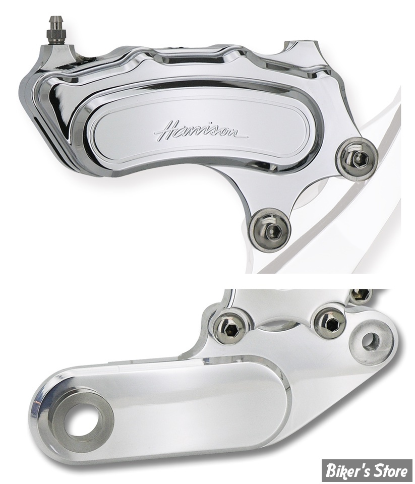 Ken Harrison de Harrison Engineering a été un des premiers dès 1986 à développer et dessiner des étriers de freins multi-pistons pour Harley-Davidson. Chaque étrier 4 ou 6 pistons est usiné CNC à partir d'aluminium qualité aviation. Pour conserver des tolérances internes minimales ces étriers légers sont fabriqués à partir d'un aluminium à faible dilatation thermique. Les pistons ont une finition anodisée dure qui a les mêmes propriétés que l'acier pour éviter les frictions. Il y a un jeu de plaquettes pour chaque paire de pistons ce qui est meilleur en temps de pluie car le premier jeu de plaquettes évacue la pluie pour les autres plaquettes. Ces étriers polis miroir n'ont pas seulement un look superbe ils ont également des performances ultimes de freinage et sont disponibles pour la plupart des modèles. Les étriers avant se fixent comme à l'origine tandis que les arrières ont une patte de fixation fournie. Des rondelles de calage ainsi que les vis sont fournies dans chaque kit. L'avant comme l'arrière existent en version 4 ou 6 pistons et sont polis miroir ou anodisés noir. Leur design qui se marrie parfaitement avec les disques Harrison's que vous trouverez ailleurs dans le catalogue. Tous les étriers Harrison sont approuvés par le TÜV et ont une garantie à vie limitée.