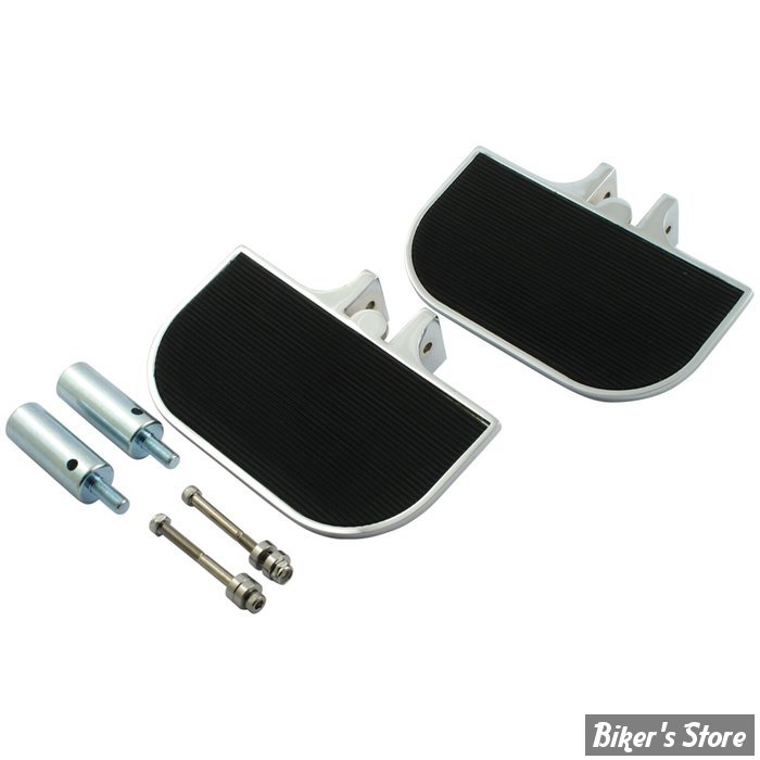 Chrome plated. Die-cast aluminum. Can be used in place of most small diameter passenger, rider or highway pegs found on FX, FXR, FXST and XL models. A two position angle lets you adjust the floorboards to two different positions. Complete with mounting supports for the boards. Supports install with a 3/8-24 threaded stud.