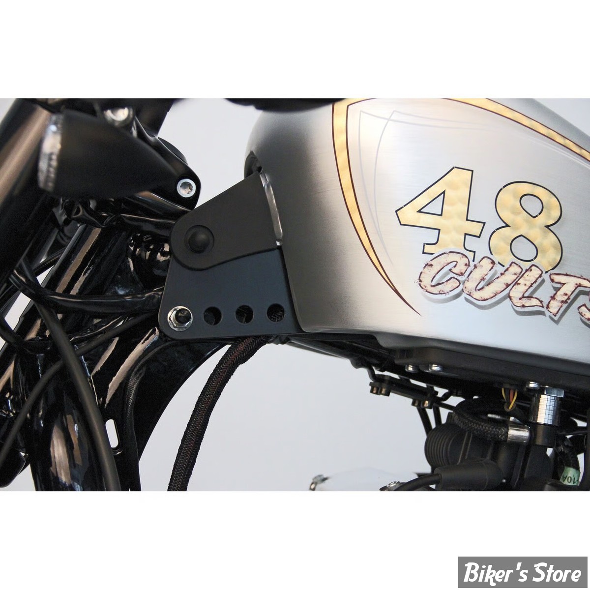 Steel. Gloss black powder coated. 35-50mm height adjustable lift. Mounts to the front fuel tank mount and is height adjustable. Great looks and you can now position the main wiring harness between tank and frame, without wiring modifications, for a super clean look. Includes hardware.