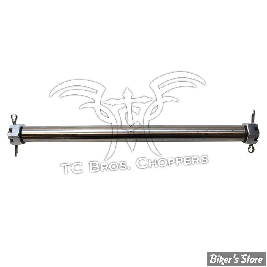 TC Bros Stainless Axle Kit for 130-150 Tire Sportster Hardtails (Part #103-0009). Sure, you can use your zinc plated steel stock Sportster axle on our 130-150 series Sportster Hardtails, but why not upgrade to this great looking, premium quality axle and truly complete your build? These axles are constructed from 17-4 PH Stainless Steel for the ultimate combination of strength and corrosion resistance. After CNC Machining these axles, they are then Centerless ground for precision fit to your wheel bearings. To put the quality of this material into perspective, it is helpful to compare to a more common material such as 1018 Cold Rolled Steel. 1018 cold rolled steel has a Yield Strength of 54,000 psi whereas the 17-4 PH Stainless that these axles are made from has a Yield Strength of 118,000 psi. In other words, 17-4 PH Stainless is more than twice the strength of 1018 cold rolled steel! You will not find a higher quality axle for your ride! DIMENSIONS: 3/4" (.75") diameter bearing surface, 5/8"-18 UNF Threaded ends, 11 7/8" Overall Length, 10.2" Shoulder To Shoulder