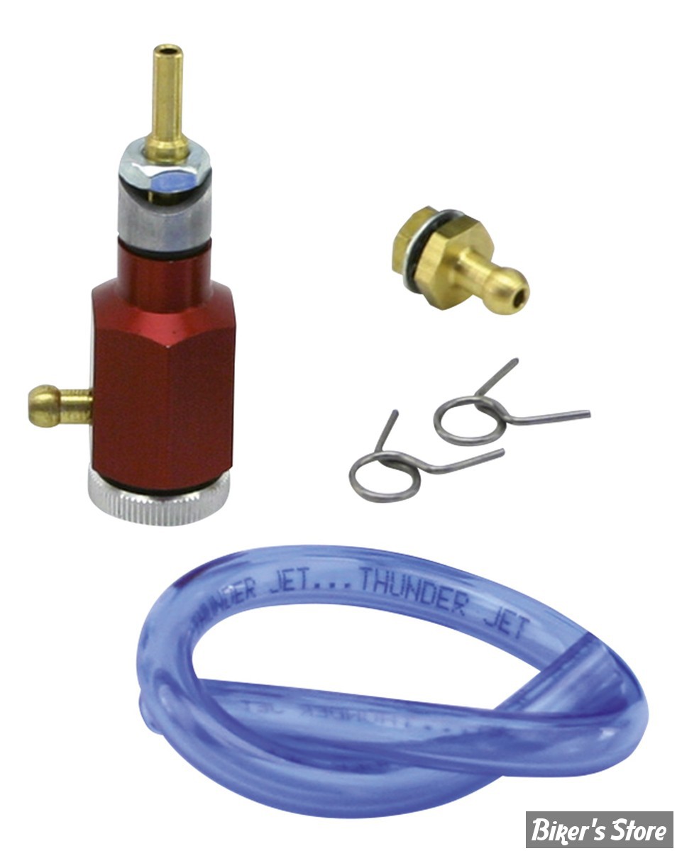 Rouge - Pour carburateur S&S B, D, E, G, Bendix et Keihin Butterfly. Ce système comporte un système de correction d'air intégré qui résout de manière permanente le problême de richesse entre bac et haut régime. Fonctionne à travers une grande variété de conditions d'altitude et pression atmosphérique. Disponible en finition noir, rouge ou bleu. Le Kit.