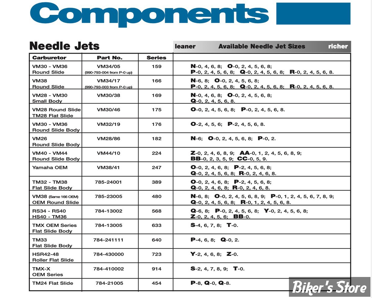 (Voir le tableau pour les caractéristiques). Needle Jet (Emulsion tube), VM30 Carb, VM32 Carb, VM34 Carb, VM36 Carb. La Pièce