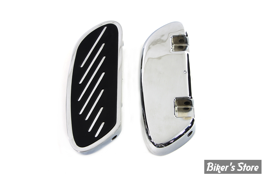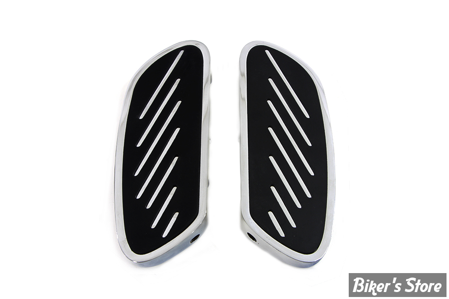 Chrome billet passenger footboard set with a rubber rail design. Chrome insert features inlay rubber pad.