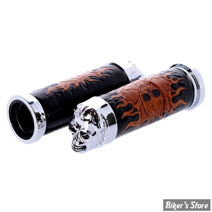 Aluminum throttle grip set with cushion foam beneath a genuine leather wrap in a black/brown Skull & Flame design. Complete with chrome plated skull end caps.