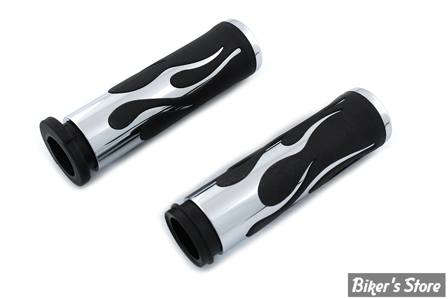 Grip set has chrome flame outer and molded rubber inner sleeves. Set is for use on throttle by wire models.