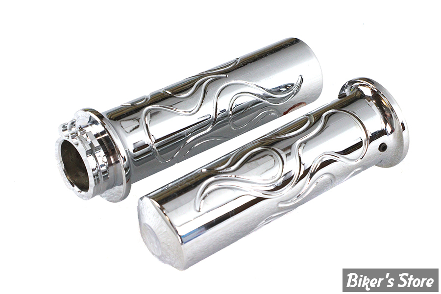 Flanged grip set with flame deisgn for single or dual throttle application. This is for 1" handlebars.