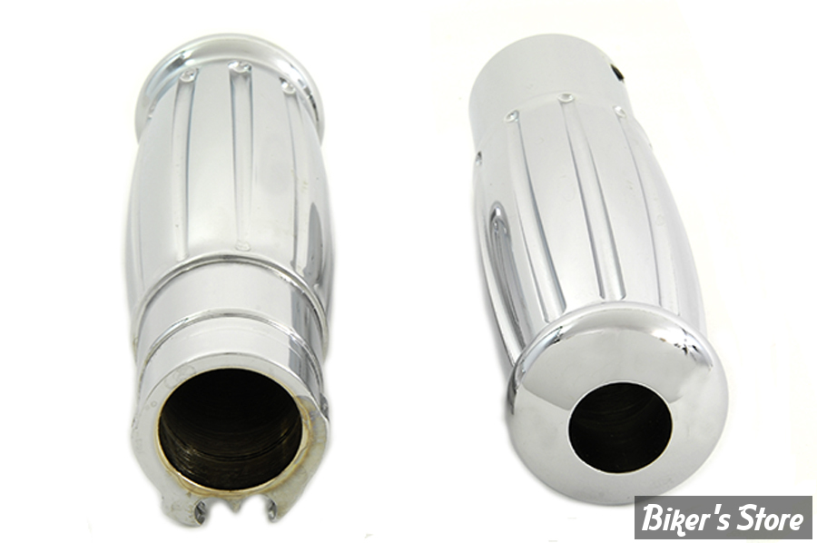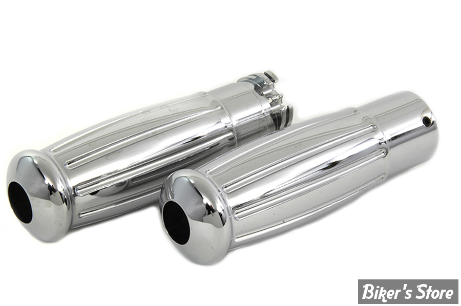 Chrome billet vintage style grip set accepts single or dual cable assemblies.