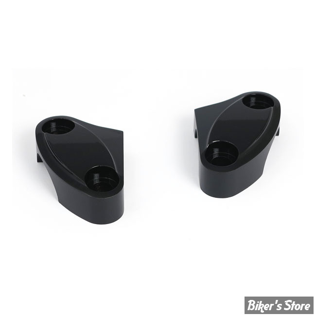 Billet aluminum 2-piece riser clamps to replace the stock style 1-piece clamp. Fits the OEM straight and pullback stock style risers, with 3-1/2" distance between riser mount bolts and offset top clamp bolts, and all handlebars with 1" diameter clamping area, as used on various 73-up Big Twin and XL Sportster models with 1" diameter handlebars.