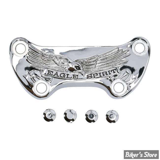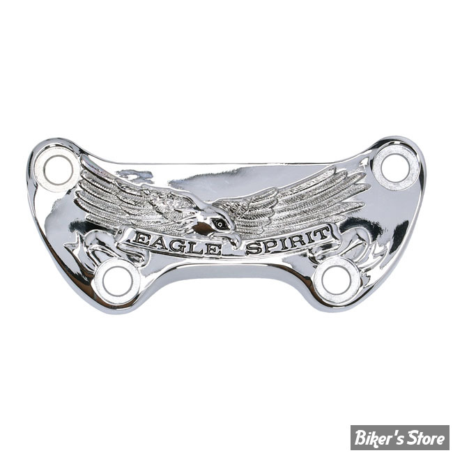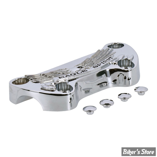 Chrome, Eagle Spirit. Fits oem style straight and pullback risers as used on various 73-up Big Twin, XL Sportster (excl. FLT Touring models) with 1" diameter handlebars, 3-1/2" distance between riser mount bolts and offset top clamp bolts.
