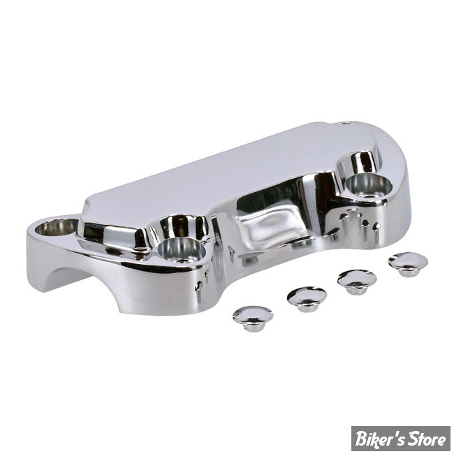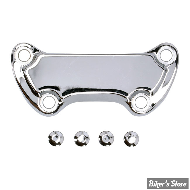 Chrome, Scalloped. Fits oem style straight and pullback risers as used on various 73-up Big Twin, XL Sportster (excl. FLT Touring models) with 1" diameter handlebars, 3-1/2" distance between riser mount bolts and offset top clamp bolts.