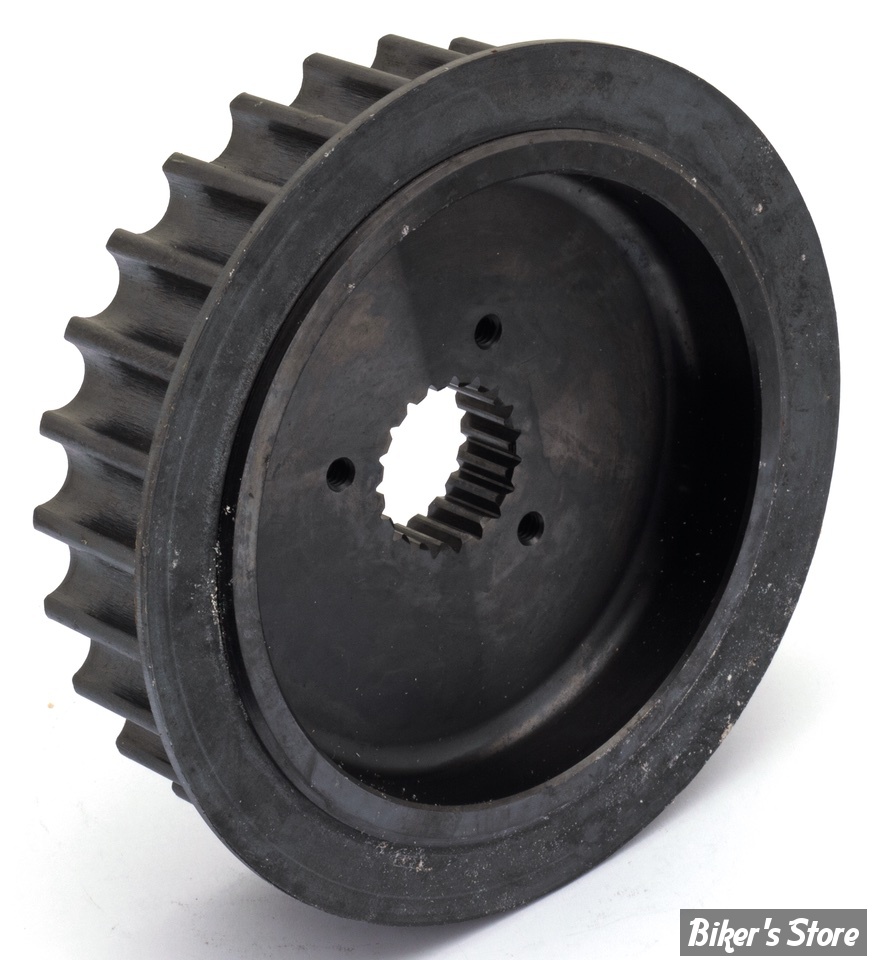 Steel 27 tooth transmission stock width belt pulley has a center hole diameter of 7/8" with 19 splines.