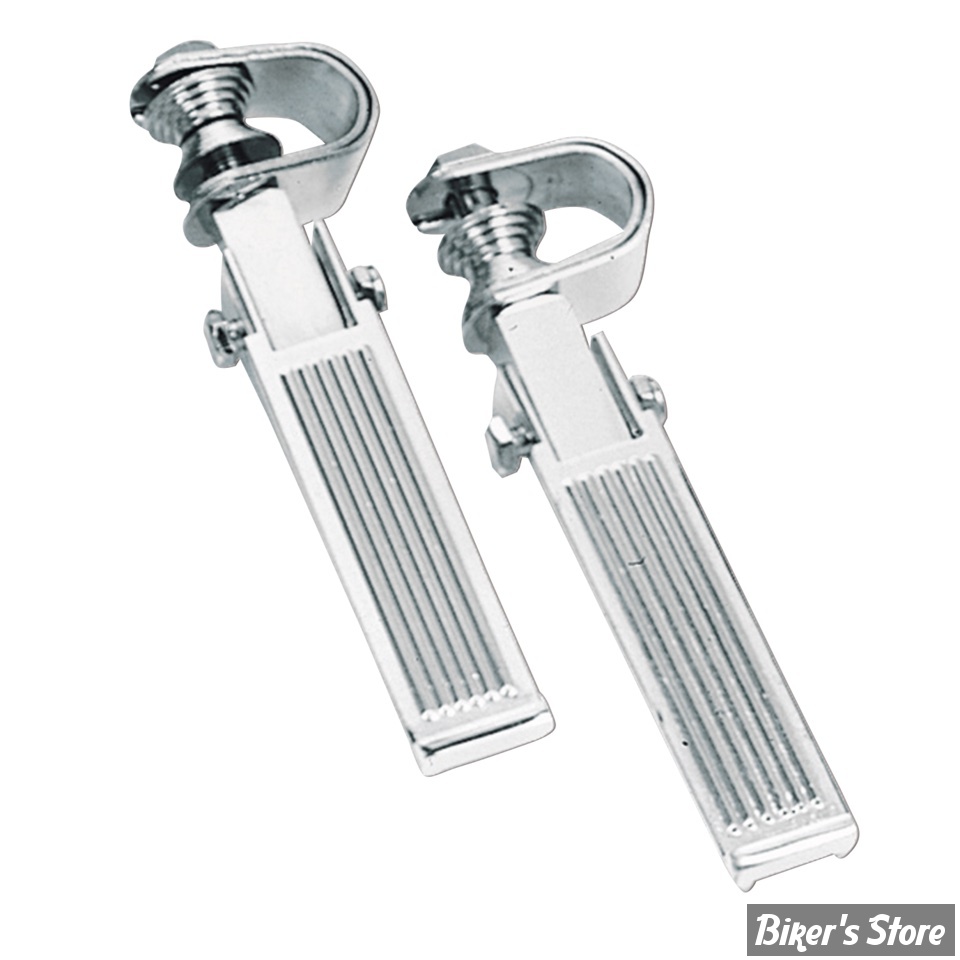 Repose-pieds rabattables chromés et à prix abordable. Comporte deux tailles de pince pour montage sur cadre ou sur barre pare cylindres de 1" et 1 1/4" (25.4mm et 31.8mm). Vendu en paires.