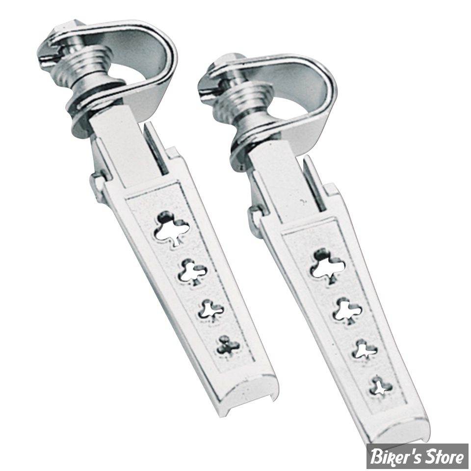Repose-pieds rabattables chromés et à prix abordable. Comporte deux tailles de pince pour montage sur cadre ou sur barre pare cylindres de 1" et 1 1/4" (25.4mm et 31.8mm). Vendu en paires.