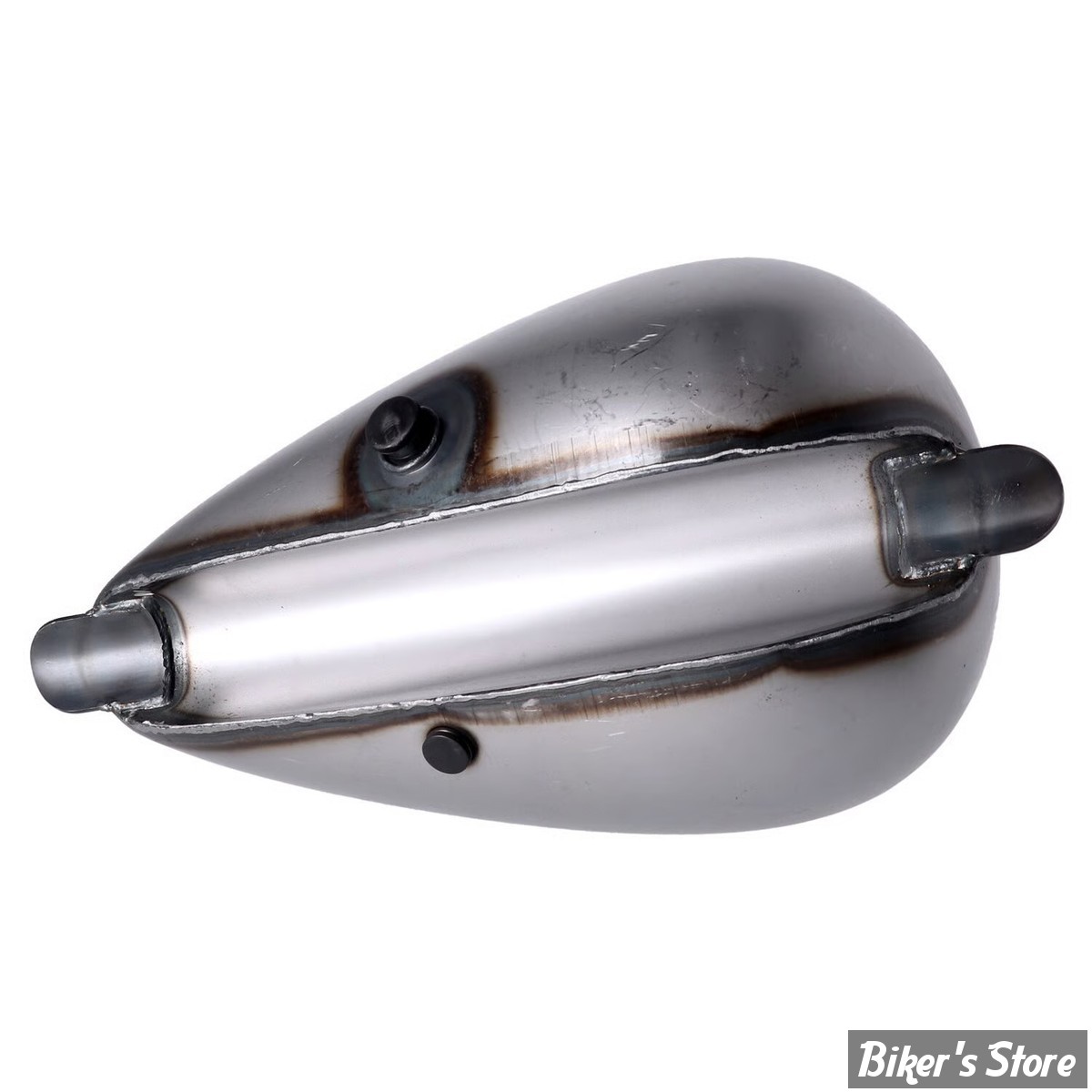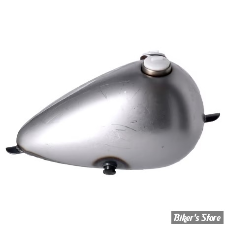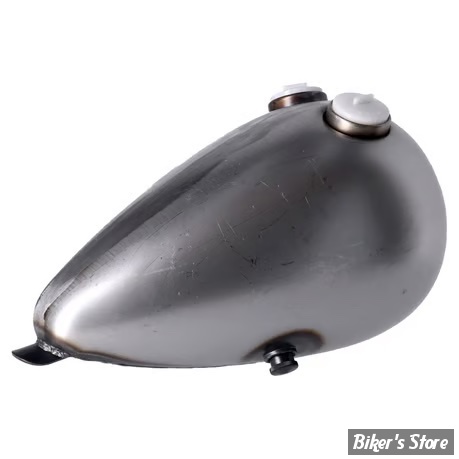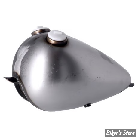 Small 2.2 gallon (8.3 liter) custom fuel tank with universal mount tabs for easy installation. With right side bung for 3/8" NPT threaded petcocks. Left side bung is 1/2"-20 threaded, which can be used as a drain plug to easily drain old fuel after the winter storage. A (drain) plug is not included. Takes pre-83 bajonet style gas cap. Approx. dimensions: 14-3/4" (37.5cm) long x 7-3/4" (19.7cm) wide. Tunnel height front: 3" (7.6cm), rear 1-3/4" (4.4cm), length 15" (38cm).