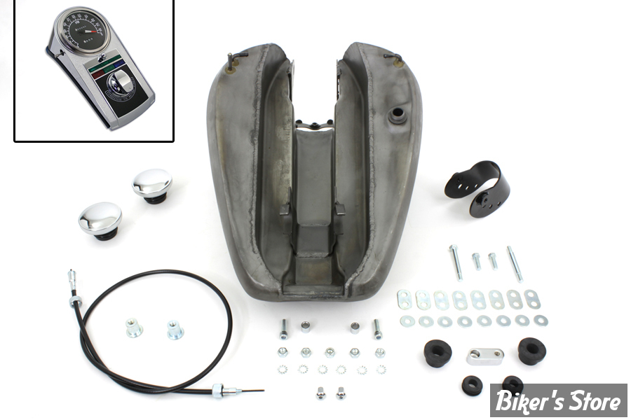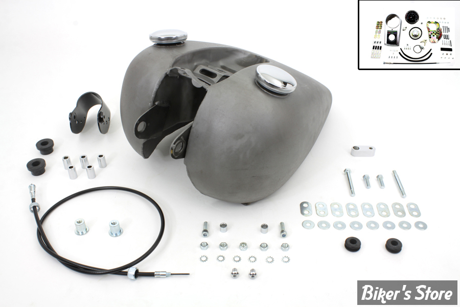 Tank kit features a chrome cast dash kit with a 2:1 tombstone style speedometer with a black face, chrome bung style late caps, and all necessary mounting hardware for installation. Check the tank for flaws and fit before painting. Do not grind or sand the seams or joints. Clean the inside of the tank. It is suggested to pressure test and use a tank sealer. We suggest using Kreem gas tank combo kit to clean, condition and seal to help stop leaks and prevent corrosion. Check petcock opening, making sure the petcock can be easily installed. Petcock fitting should be masked or plugged during painting for easy installation of petcock.