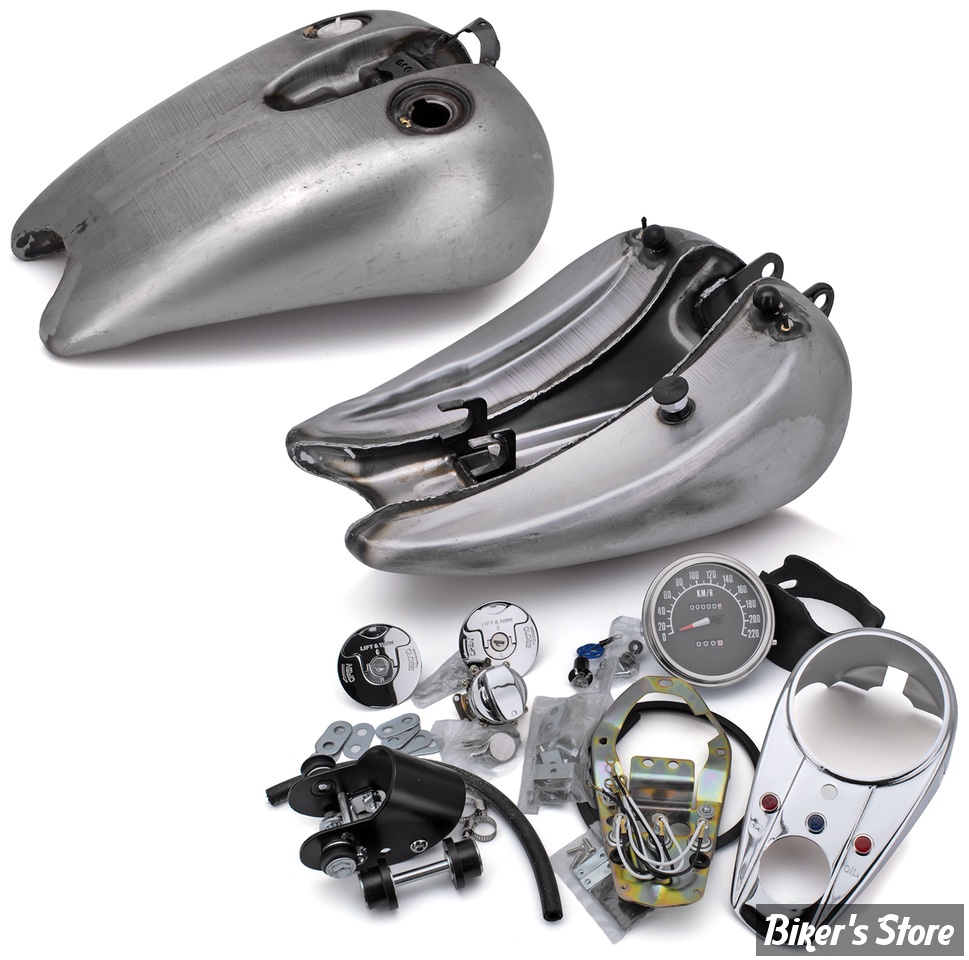 C'est un réservoir custom rallongé avec une console dessus. Ce réservoir donnera à votre Sportster ce look très recherché qui le rendra long, actuel le tout avec uneligne très fluide. La console sur le réservoir accentuera le look Big Twin. Ce kit très complet comprend le réservoir, au choix des bouchons à vis ou aviation à clef mais également la console chromée avec ses trois voyants ainsi que le compteur (en Km/h) avec remise à zéro, le caoutchouc et le contacteur à six pôles Fat Bob! La partie rallongée du réservoir n'est pas un rajout soudé mais une partie intégrante du réservoir avec une échancrure à l'arrière pour selles étroites du style Silhouette. La contenance est de 3.4 gallons (12,9L.).