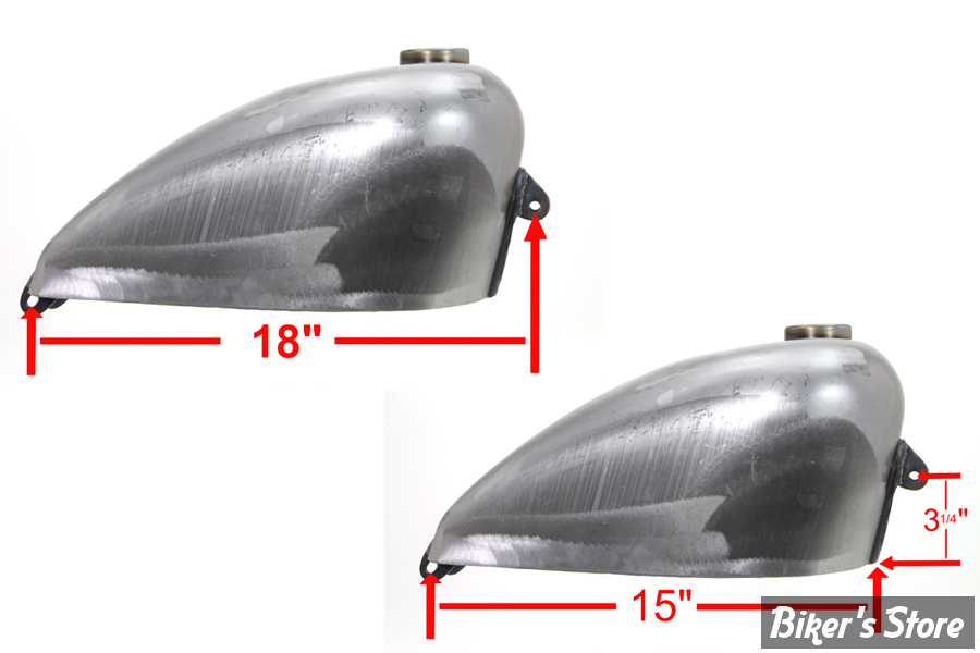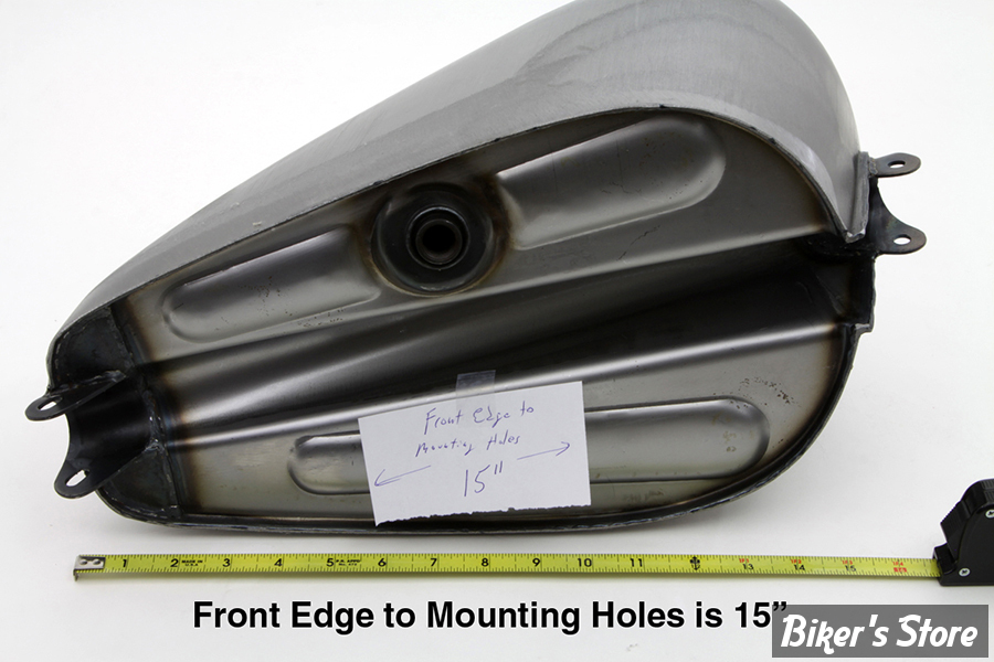 Please test fitment before painting. Tank weld seams may require filler to meet your individual requirements. Do not grind or sand the seams or joints, as this may cause leaks. We suggest using Kreem gas tank combo kit to clean, condition and seal. This will help to stop leaks and prevent corrosion. Check petcock opening, making sure the petcock can be easily installed. Petcock fitting should be masked or plugged during painting for easy installation of petcock. The front edge to the mounting holes measures 15", the front bottom edge to the upper mounting holes measures 3-1/4", and center to center from the front to rear mounting holes measures 18". *NOTE: UPS may consider this part as packaged "oversize" for shipment, as compared to the actual weight, which will result in higher shipping costs.