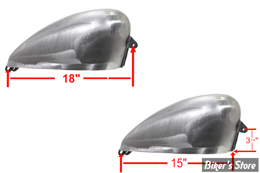 Please test fitment before painting. Tank weld seams may require filler to meet your individual requirements. Do not grind or sand the seams or joints, as this may cause leaks. We suggest using Kreem gas tank combo kit to clean, condition and seal. This will help to stop leaks and prevent corrosion. Check petcock opening, making sure the petcock can be easily installed. Petcock fitting should be masked or plugged during painting for easy installation of petcock. The front edge to the mounting holes measures 15", the front bottom edge to the upper mounting holes measures 3-1/4" and center to center from the front to rear mounting holes measures 18"