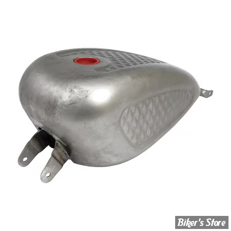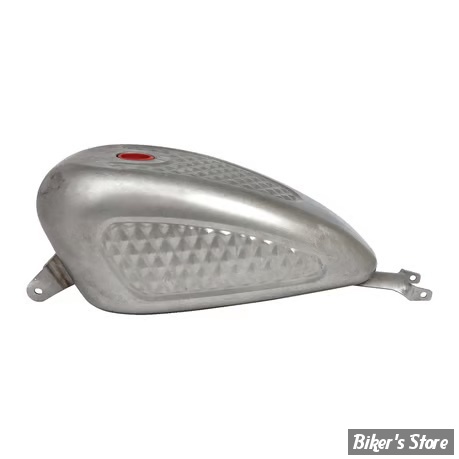 3.3 gallon (12.5 liters) fuel tank. Compatible with the OEM fuel pump. For 96-up screw-in style gas cap (not included). Approx. measurements tank mounts (center line to center line) 58.5cm, length of tank 47.5cm, total height 21cm, total width (widest point) 27cm. Note: It is advised to pressure test, seal and test fit all tanks before tanks are painted and installed. Some tanks are painted, but this coat is applied for rust prevention during storage only.