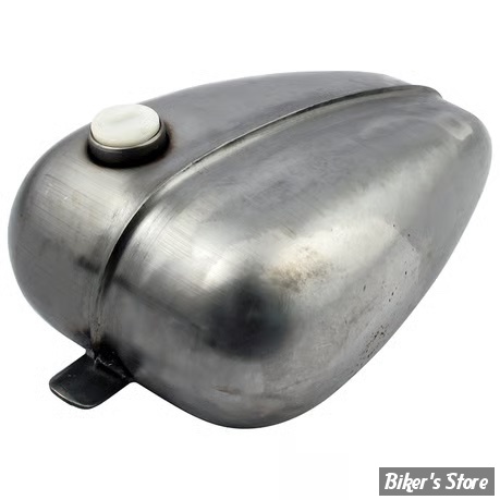 3.3 Gallon (12.5 liter). For pre-83 bajonet style gas caps (not included). The classic since decades, in a cool old school ribbed version. Takes a 3/8 NPT petcock, located on the right side. The rear section is equipped with 1/4" fuel outlets. Dimensions approx. 17" long x 11.5" wide, tunnel width 2".