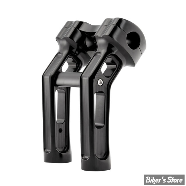 7" (17.8cm) tall risers with an added 1-1/2" (3.8cm) kickback to provide the proper mix of comfort & control. Risers are CNC machined billet aluminum with a black anodized finish. Each billet riser features machined windows and sculpted pockets. Billet crossbar is integrated into each riser for added rigidity & for using a wire guide during installation. Specially designed uprights allow riser to be installed in the center of the factory triple tree nacelle opening on 2024 bagger models. Works with factory & aftermarket triple trees with 3.5" riser spacing. Not for 4" gauge mount. Accepts handlebars with 1" clamping area.