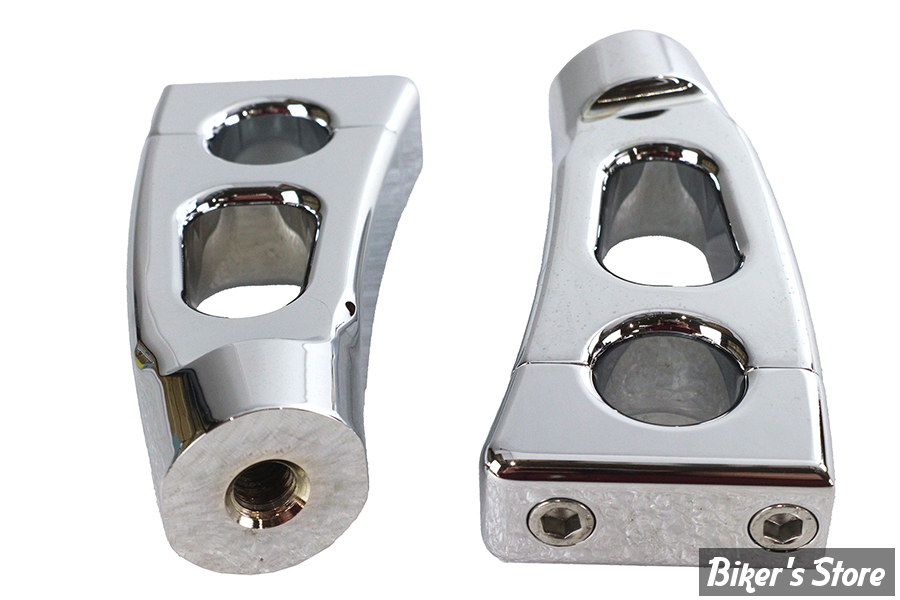 Switchback riser set has a radical design that is sure to get attention. Risers are billet with a chrome finish,a 4-1/4" rise, and a 1" set back. Mounting is done with 1/2-13UNC threaded bolts.
