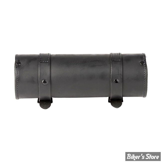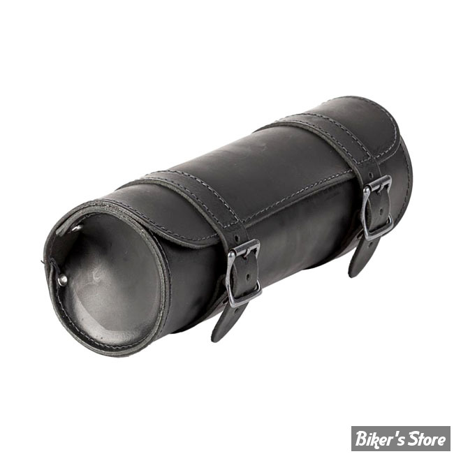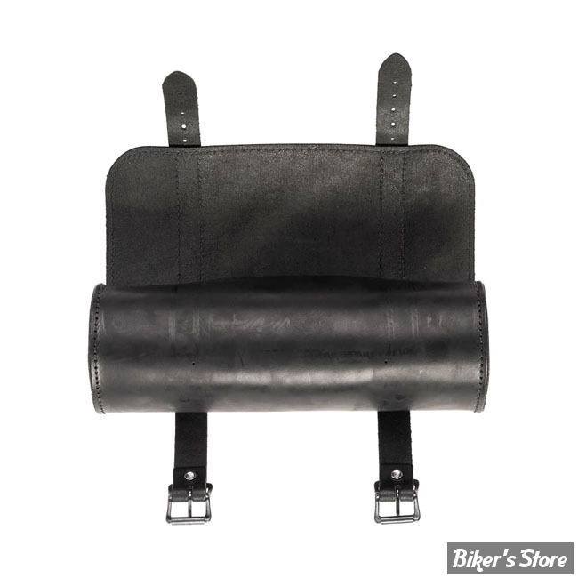 Black leather with black buckles. Installs with included leather straps. Capacity 1 liter. Approx. dimensions 30cm wide x 11cm diameter. Note: Dimensions and capacity are approximate and for reference only.