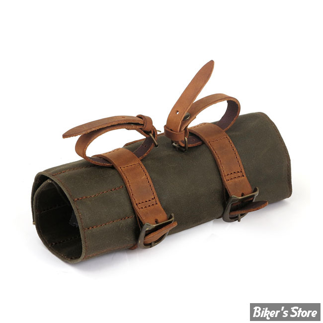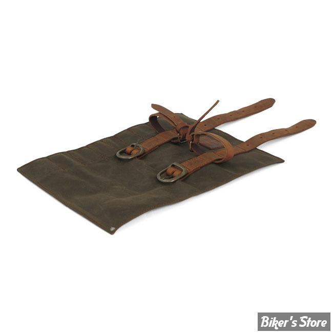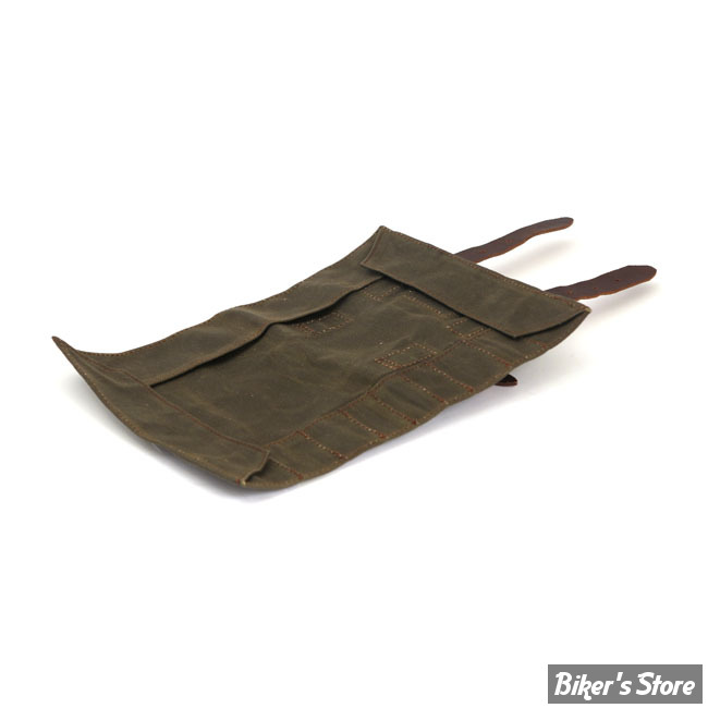 Made from waxed cotton and ranger leather straps. Rolls open and offers pre-stitched compartments for tools and other necessities. Installs with included leather straps. Approx. dimensions open: 35cm x 25cm.